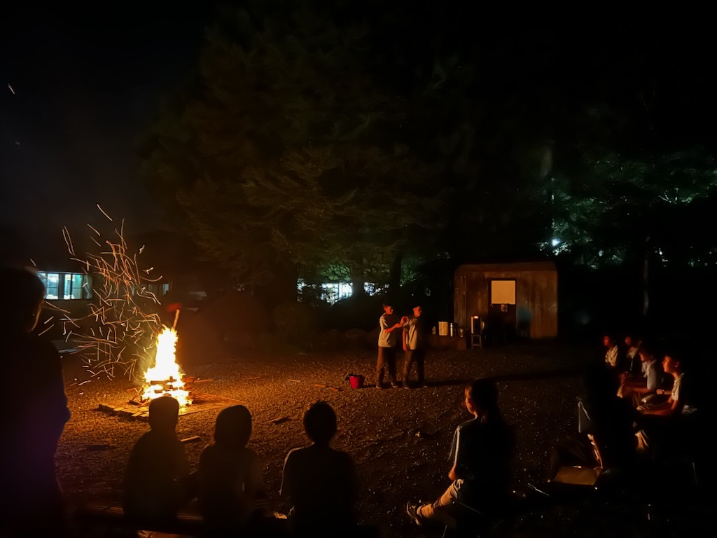 夜になると肌寒さを感じますが、子どもたちは暗く美しい夜空の中キャンプファイヤー!