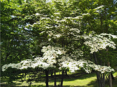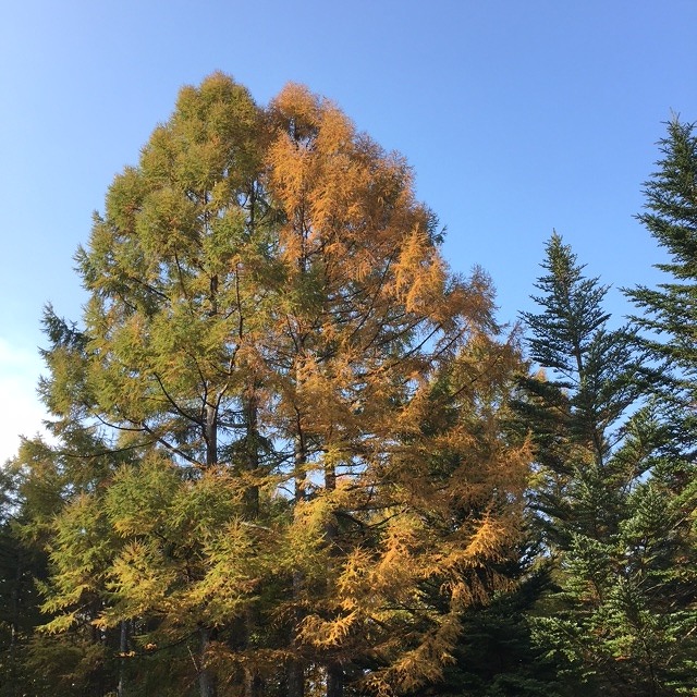 このカラマツは漢字で「唐松」(中国の「唐絵」の木に似ているから)または「落葉松」と書きます。普通の赤松などは常緑針葉樹(冬でも落葉しない)なんですが、字のように冬になると紅葉(きいろ)してその後葉が落ちて春に新芽が出ます。多くは戦後、緑化運動などで植林された「人工林」です。成長が早く長野県では特に多かったようです。