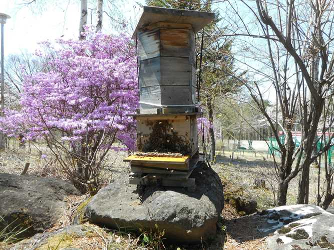 写真は学習花壇内の二ホンミツバチ巣箱全景です。