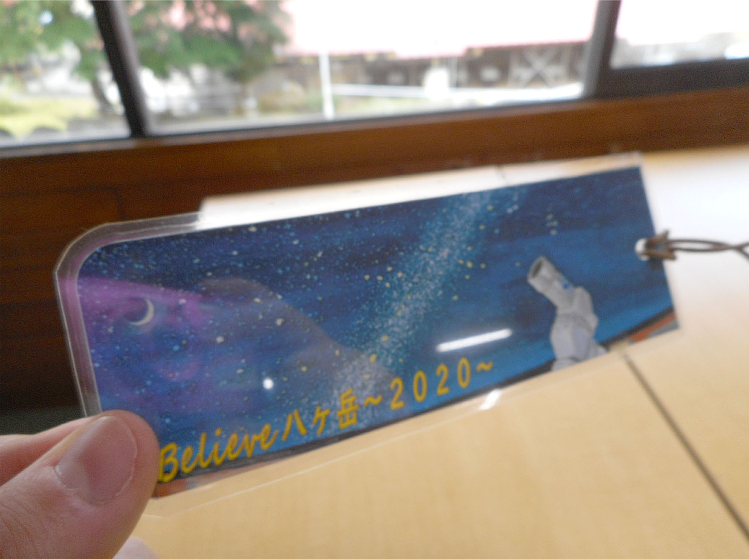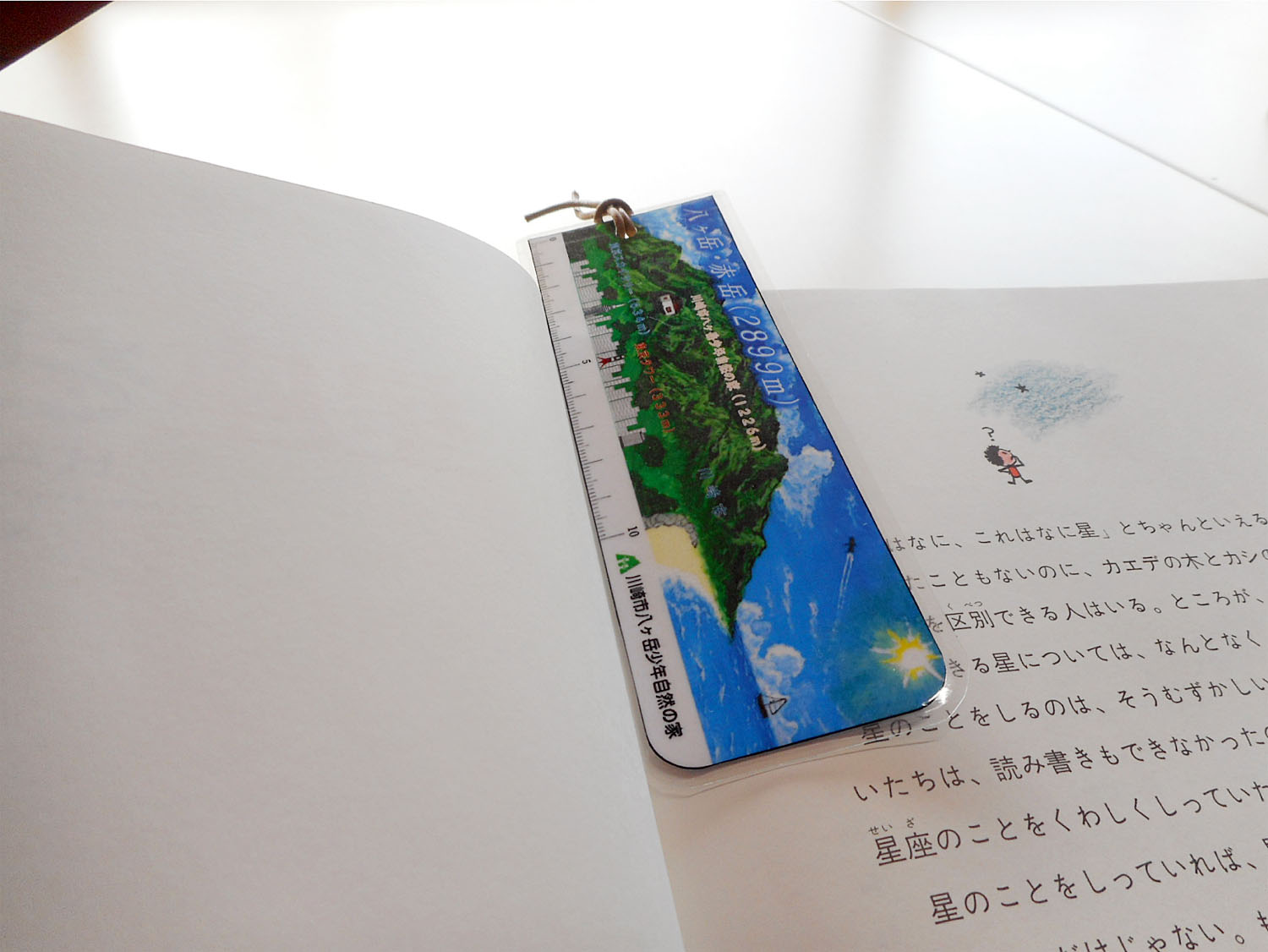 この「栞」の絵は、表には自然の家・八ヶ岳の標高と10cm定規が描いてあります。(栞内に八ヶ岳を描く関係で、実際に見える八ヶ岳とは少し異なります)裏には、川崎市八ヶ岳少年自然の定番でもあるアストロハウスから見た夜空を描いています。裏の絵には実際に見える星座も描いてありますので、探してみてください!