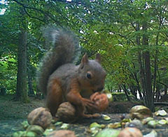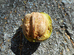 それを人間が拾っているのですが、リスもクルミが大好きで、リスは木に登って仮果のまま収穫し周りの硬い皮をむいて堅果を取り出します。