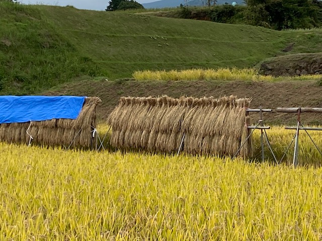 | (写真3)秋 稲刈りが始まり、刈り取った稲を天日干ししてます。 |