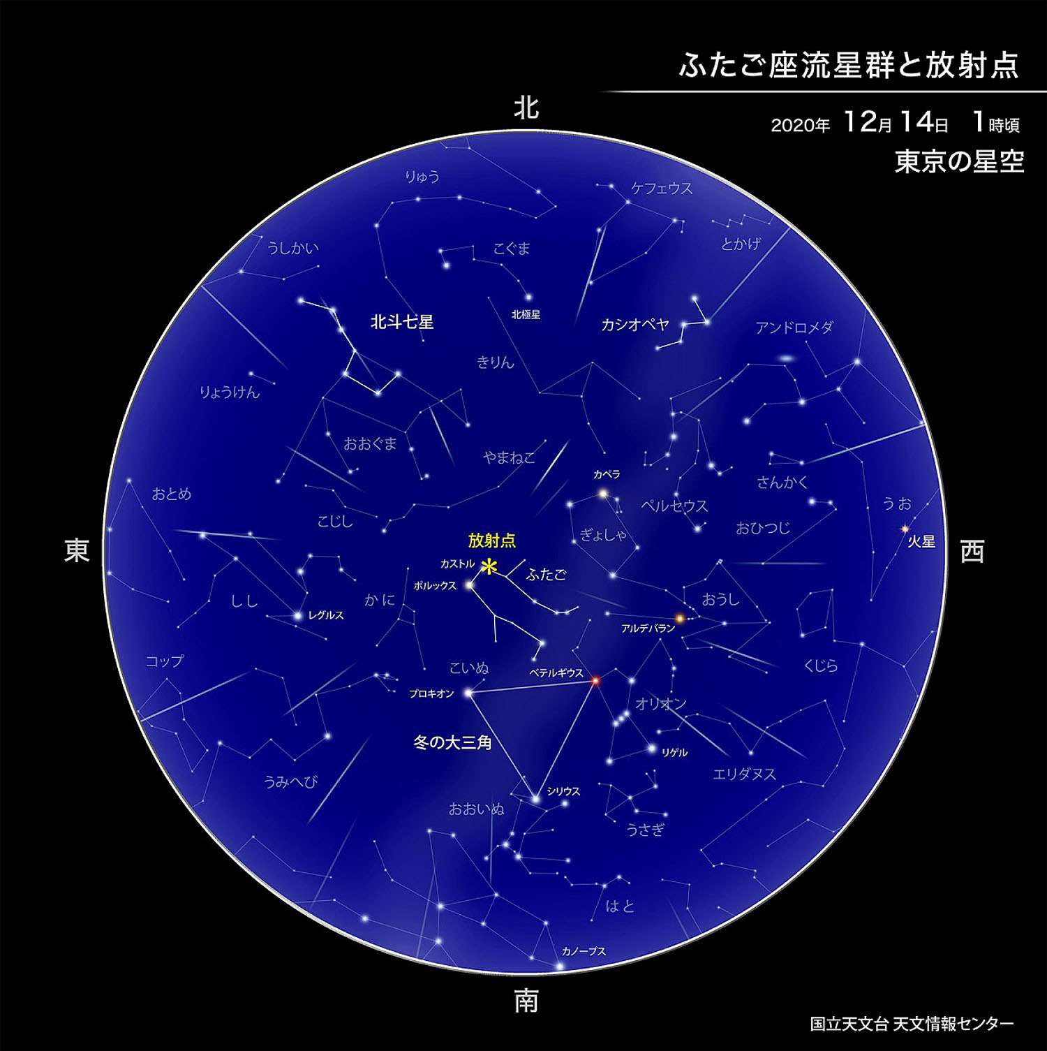 2020年今年のふたご座流星群の活動は、12月14日1時頃に極大を迎えると予想されています。今年は、極大が日本で観察しやすい時間帯に比較的近い上、15日が新月のため月明かりの影響もなく、かなり良い条件で観察出来そうです。