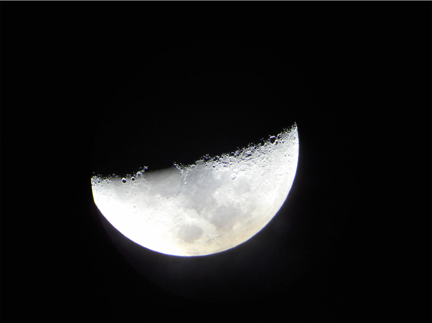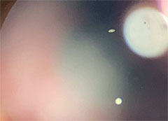 | (写真3)偶然望遠鏡とカメラのピントが合い、土星の輪と木星の模様がギリギリ見えます。 |